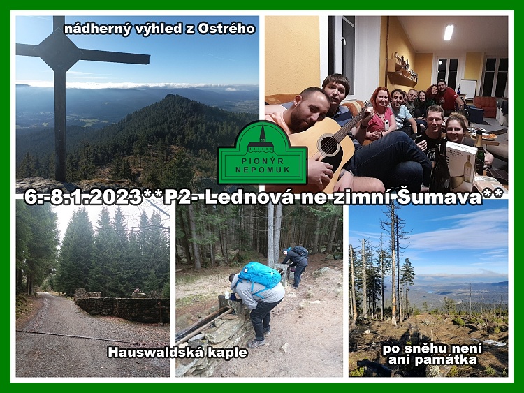 O víkendu 6.-8. ledna se naše parta z P2 jako každý rok vydala objevovat kouzla Šumavy. Základnou nám byla pionýrská klubovna v Zelené Lhotě, kde bydlíme již dlouhou řádku let. Obyčejně jezdíme běžkovat a brázdit sjezdovky, ale letos, letos jsme byli bohužel bez šance. Sněhu ani vločka, a tak nás čekaly hlavně pěší výšlapy v takřka jarním, krásně prosluněném počasí. Sobotní ráno jsme začali vydatnou snídaní, abychom byli plní síly na naše túry. Část naší party se vydala na vrchol Ostrý, část šla objevovat krásy ledovcových karů Černého a Čertova jezera, a někdo se zase vydal na Pancíř. Každý dle své chutě. Počasí nám opravdu přálo a šumavské scenérie byly opravdu balzámem na duši. Po návratu na naši základnu jsme společně zhodnotili výlety, probrali své životní strasti i radosti a za zvuku sladkých dřev jsme zdárně zakončili naší expedici. V neděli už jen úklid a smutné loučení. Někteří ještě vyrazili na závěrečnou snídani do Cafe Charlotte a následné poslední zbytky víkendové party vyrazili na vycházku kolem Vchynicko - Tetovský plavební kanál a zbytky Hauswaldské kaple. Tak zase příští rok! **VH