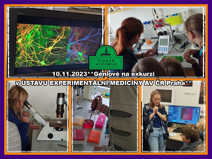 Ráno 10.11.2023 jsme se sešeli na Pionýru, řekli si co nás celý den bude čekat a vydali jsme se směr nádraží, odkud jsme vlakem jeli do Plzně. V Plzni jsme šli na oběd a poté jsme nasedli na vlak směr Praha. V Praze na nás čekala exkuzre v laboratoři Neurochemie, kde se děti seznámily s laboratorním náčiním. Děti si zkusily pipetovat, odměřit přesné množství kapaliny, vyzkoušely si, jako se odstřeďuje, prohlédli si myší mozek a dozvěděli se jak funguje náš mozek a jak vypadají neurony. V laboratoři plné mikroskopů si děti vyzkoušely práci s mikroskopem a zkumaly neurony v mozku. Poté nás čekala cesta zpět domů. Celý den jsme si velice užili.**LenkaSk