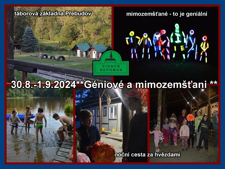 Géniové se rozloučili s prázdninami na víkendovém pobytu v Přebudově (30.8.-1.9.2024). Po příjezdu se všichni ubytovali a seznámili se s okolím. Najednou, kde se vzal, tu se vzal podivný dopis psaný podivným písmem. Géniové se rychle pustili do luštění, až se jim podařil dopis rozluštit. Byl to vzkaz od mimozemšťana, který zde ztroskotal, díky odpadkům, na naší Zemi. Mimozemšťan prosil Génie, aby mu vyrobili kosmickou loď a přinesli jí v sobotu večer k rybníku. Géniové se druhý den pustili do výroby. Loď vyrobili z materiálů ( polystyren, kabely, alobal, atd..), které našli při úklidu v okolí tábora. Po setmění Géniové netrpělivě čekali na signál. Najednou se objevila osvícená cesta. Géniové se s lodí po ní vydali. Cesta vedla lesem a na jejím konci byl osvícený kruh, ve kterém Géniové čekali na mimozemšťana. Mimozemšťan přišel po vodě, všem poděkoval za vyčištění okolí a výrobu lodi. Jako poděkování nám dal spadlé hvězdy a zmizel. Géniové si chatky vyzdobili hvězdami, které svítily celou noc. V neděli se Géniové seznámili s ochranou vodních toků a naučili se poznávat vodní živočichy s mladým rybářem Lukášem. Po osvěžení v rybníce se Géniové rozloučili s táborem. A v pondělí hurá do školy.**LenkaS