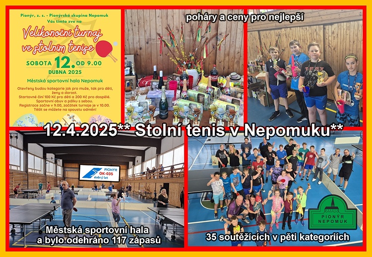 V sobotu 12. dubna uspořádal Pionýr, z. s. - Pionýrská skupina Nepomuk - Oddíl stolního tenisu v nepomucké sportovní hale velikonoční turnaj ve stolním tenise. Akce se zúčastnilo včetně organizátorů a návštěvníků přes 50 lidí, hrajících v turnaji bylo 35. Ti se proti sobě utkali v pěti kategoriích a během celého turnaje jsme odehráli rovných 117 zápasů. Výsledky jednotlivých kategorií jsou následující ..po rozkliknutí nadpisu**Miloslava R.