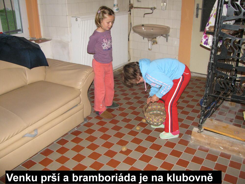 Počasí opět nám nepřálo, pršelo, zima a louka byla pořádně promočená. Sešli jsme na pionýráku a v teple klubovny jsme uskutečnili trochu improvizovanou Bramboriádu.