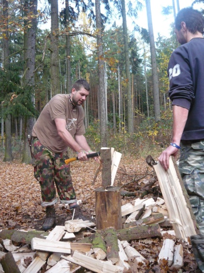 V pátek jsme vyrazili v celkem hojném počtu sedmi lidí směr Mačkov, kde na nás již čekala tma. Dvoukilometrový přesun ke kapličce a po malé pauze jsme se ponořili do temného lesa, kde jsme opět doufali v nalezení cesty, která vyústí přesně u chaty. Opět se nezadařilo, ale objevili jsme se u rybníka, odkud je to k chatě jenom kousek. Na místě už na nás čekal oheň, který nám opekl klobásky, zeleninu a jiné potřebné věci k večeři. Popovídali jsme si, dokonce pár kytarových akordů zaznělo a šli jsme spát. Druhý den jsme znovu rozdělali oheň a u něho posnídali. Chvíli jsme vrhali prakem, prošli se po okolí, zbarveném podzimem a přitáhli nějaké dřevo, abychom doplnili zásobu. Někdo objevoval okolí v menším, někdo ve větším okruhu, ale sešli jsme se k večeři a pomalu se vydali do Lažánek. Dorazili jsme mezi prvními a tak jsme si zabrali co největší stůl a čekali na ostatní, kteří přijeli autem. Poté již začala kapela hrát a my mohli na parket. Na parketu jsme to roztáčeli, popřáli Kašíkovi k narozeninám, z tomboly, jako každý rok, vybrali téměř vše živé a odkráčeli do tmy zpět na Chvalov.Ráno jsme jen posnídali, poklidili, pobalili a vyrazili zpět na vlak do Mačkova. Tentokrát po známé cestě a tak jsme dorazili na vlak včas, který nás rozvezl všechny tam, kam jsme chtěli. Většinou to byla teplá postel a my se můžeme těšit na další rok. Ahoj Mejla