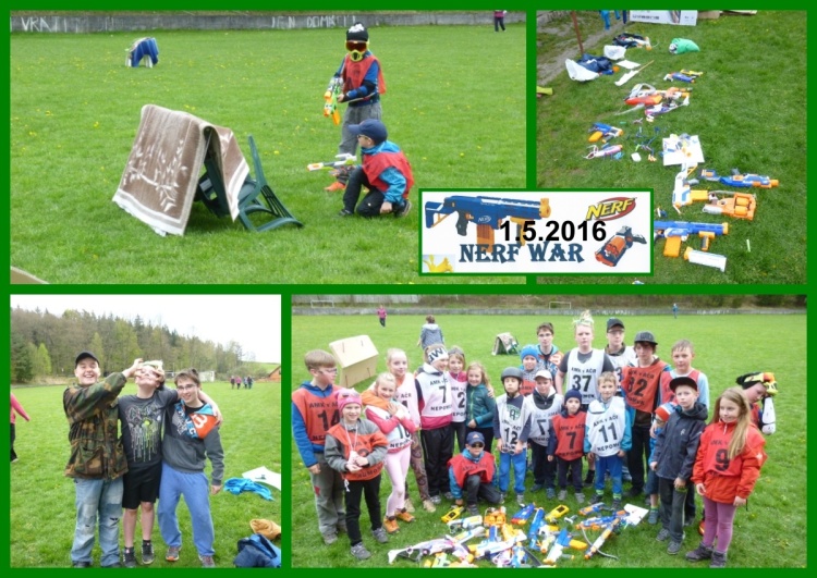 Každý prožívá SVÁTEK PRÁCE jinak. V Neurazech jsme 1.5. 2016 uspořádali 3. NERF BITVU. Účast opět veliká – spousta bojovníků a bojovnic, nádherná sbírka zbraní a dokonalá příprava některých účastníků.Pravidla si držíme přibližně stejná – každý jednu zbraň a max. 10 nábojů. Dvě zdravotnice, které vrací život, překážky na hřišti a dva týmy, které se snaží ukořistit vlajku soupeře. Stihli jsme 4 hry a 2x jednu novinku deathmatch. Myslím, že 22 bojovníků a 8 pomocníků si to hezky užili a bylo fajn, že děti opustily virtuální realitu a vstoupily na chvíli do skutečné. Každý účastník dostal krabičku KPZ, posbíraly se náboje, uklidilo se fotbalové hřiště a hurá domů. Tak zase příště v Neurazech. Chystáme se k pramenům Úslavy. Ahoj Marie Svejkovská