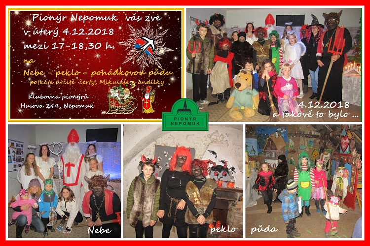 Pionýrské oddíly Pusík a Knoflíci zahájily adventní tvoření na svých schůzkách již od 26.11.2018. Vytvořené zápichy, věnce byly určeny pro výzdobu jejich pokojíčků, ale také jako součást naší vánoční výstavky. Výstavka byla k vidění na naší Mikulášské akci Nebe,peklo, pohádková půda, kterou děti zajistily na naší pionýrské klubovně pro své kamarády, známé. Vyzdobené místnosti kluboven a dvorku byly plné malých čertíků, v nebíčku nechyběl Mikuláš a andílci. Nasvícená pohádková půda se soutěžemi o cukrovíčka s vodníkem, Sněhurkou a čarodějnicí lákala všechny děti. Odměnou za básničku byl dáreček od Mikuláše, ale také čertovský párek v rohlíku a dárečky od pionýrů.Před svátky připravujeme ještě přespání na klubovně s připomenutím vánočních tradic, budeme opět tvořit a nebude chybět diskotéka v bílém.