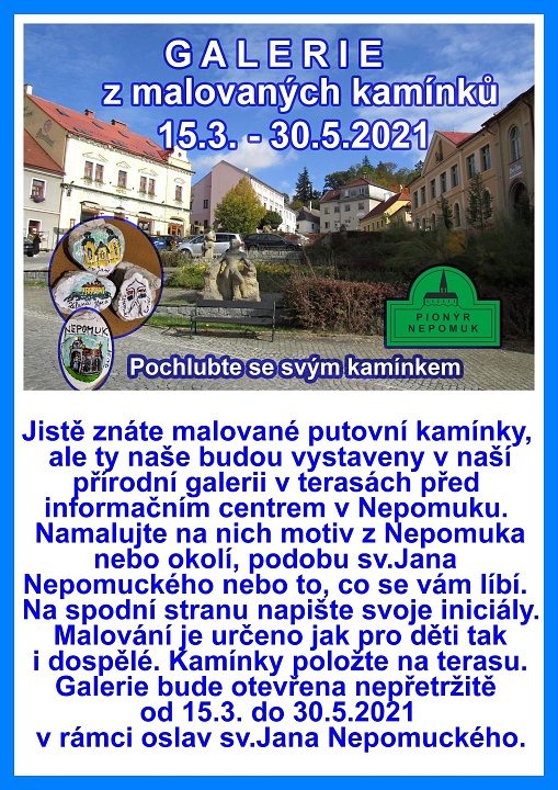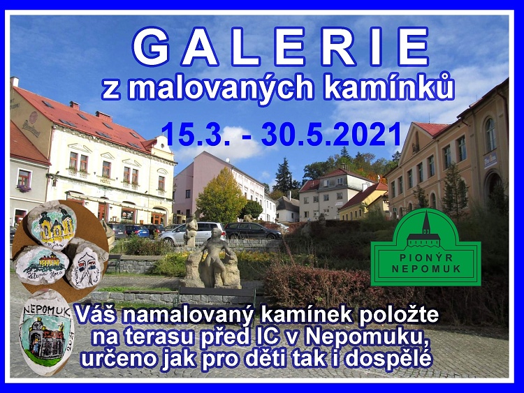 Rádi malujete, namalujte kamínek s motivem okolí Nepomuka nebo s tím, co se vám líbí. Kamínek položte na označené místo na terase před Informačním centrem v Nepomuku v době od 15.3.2021 do konce května. Malování je určeno jak pro děti tak i dospělé. Na spodní stranu kamínku uveďte vaše iniciály. Kamínek nafotíme, zařadíme do foto galerie a umístíme na terasy. Pochlubte se svým kamínek a přijďte se také ně podívat.