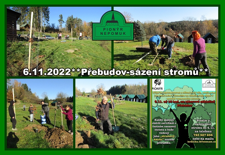 Sázení na táborové základně Přebudov v neděli 6.11.2022. Po několika propršených a mrazivých dnech jsme byli opravdu vděčni za slunný a bezvětrný den. Kolem pěti desítek pionýrů přijelo zvelebit krajinu táborové základny Přebudov. Každý přiložil ruku k dílu a byla zasazena řada nových stromů různých druhů. Nejen že jsme posunuli prostředí základny zase o trochu dál, ale také se setkalo mnoho kamarádů a přátel, kteří se hned tak nepotkají. Byl to moc příjemný den plný úsměvů, dobře odvedené práce a pohodového poklábosení u ohýnku s buřty. Snad nám stromy dobře porostou a budou sloužit.**Lucka