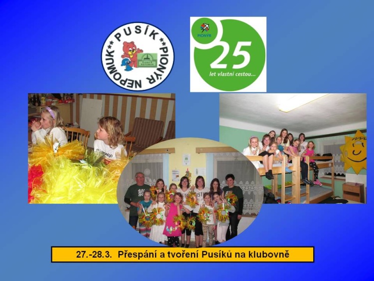 Naše dětská organizace Pionýr připravuje a organizuje volný čas dětem a dospělákům v malém městečku jižně od Plzně.
