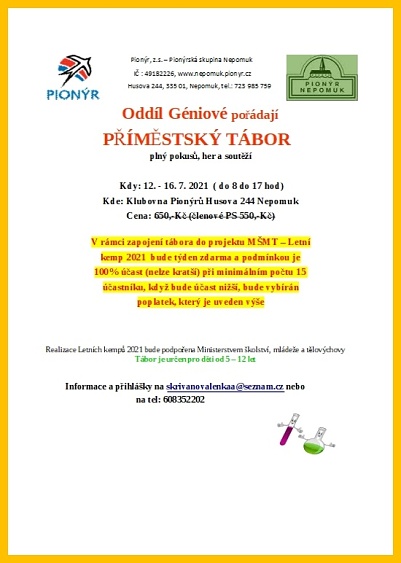 Pionýrská skupina Nepomuk připravila pro léto 2025 šest táborových běhů, tábor rodičů s dětmi a tři příměstské tábory.. O přihlášky na tábory si můžete napsat nebo zavolat na kontakty uvedené v letáčku. img